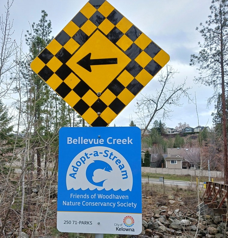 In March 2026, the City of Kelowna recognized The Friends of Woodhaven Nature Conservancy as the official stewards of a section of Bellevue Creek under their Adopt-a-Stream program! We clean up the trash along the creek twice a year and have been doing this for over two years. The City installed a sign acknowledging our stewardship. Keep in touch and join us for our spring and fall clean ups.